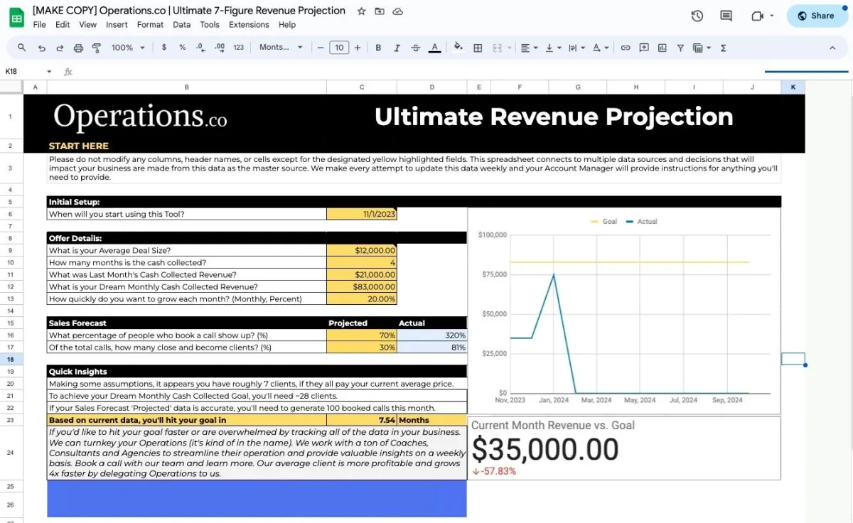 Are you tired of the constant stress and uncertainty in your business? Imagine having a tool that provides crystal-clear insights into your leads, sales calls, and projected revenue. Introducing our exclusive 7-Figure Projection Tool – the key to breaking free from the hamster wheel and achieving unparalleled peace of mind.